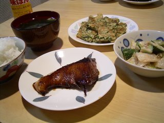] ぶりの照り焼き、きゅうりとキムチのマヨ和え、おくらのチヂミ風
