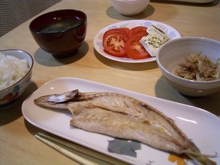 ] かますの開き、キャベツとツナのゴマ酢和え、トマト&チーズ
