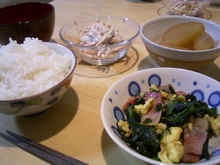 ] 大根のべっこう煮、ベーコンとほうれん草の炒め物、根菜サラダ