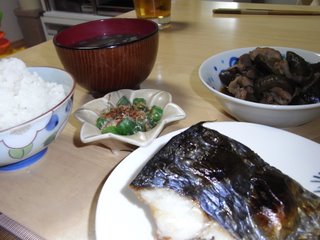 ] 鰆の塩焼き、なすと豚肉の煮たん、おくら